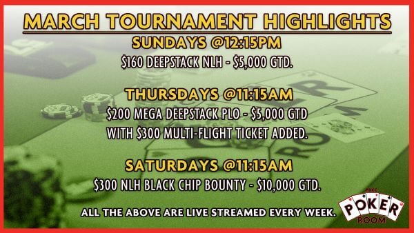 $100,000 MULTI-FLIGHT MAR. 5-8, WELCOME BAR POKER OPEN MAR. 5-9, COMEDIAN JOE DEVITO MAR. 6 PLUS HIGH HANDS EVERY DAY 9AM-12AM, PROGRESSIVE HH WEEKENDS, $15K CASH GIVEAWAY - SUPER OTB ACTION THIS WEEKEND! SEE EVENT SECTION FOR DETAILS!